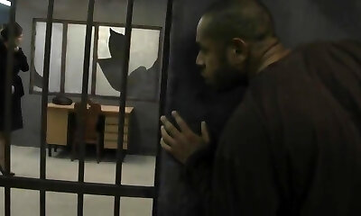 Mature blondie white lady lets a black convict grope her enormous breasts through the bars